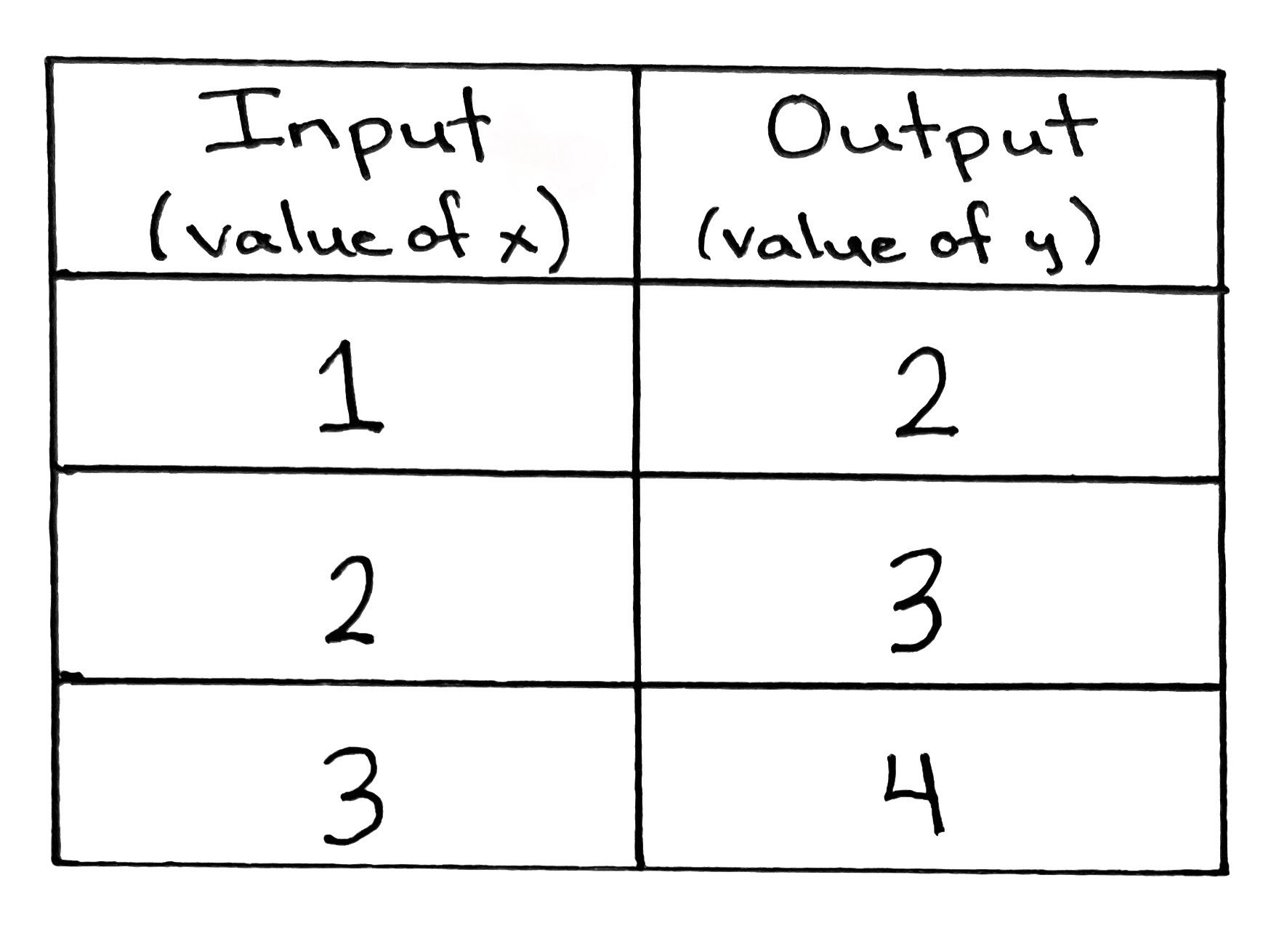 We can also illustrate this function using an input/output table. Using the example of a function that adds one to the number you put in, y = f(x +1), the numbers would look like this: