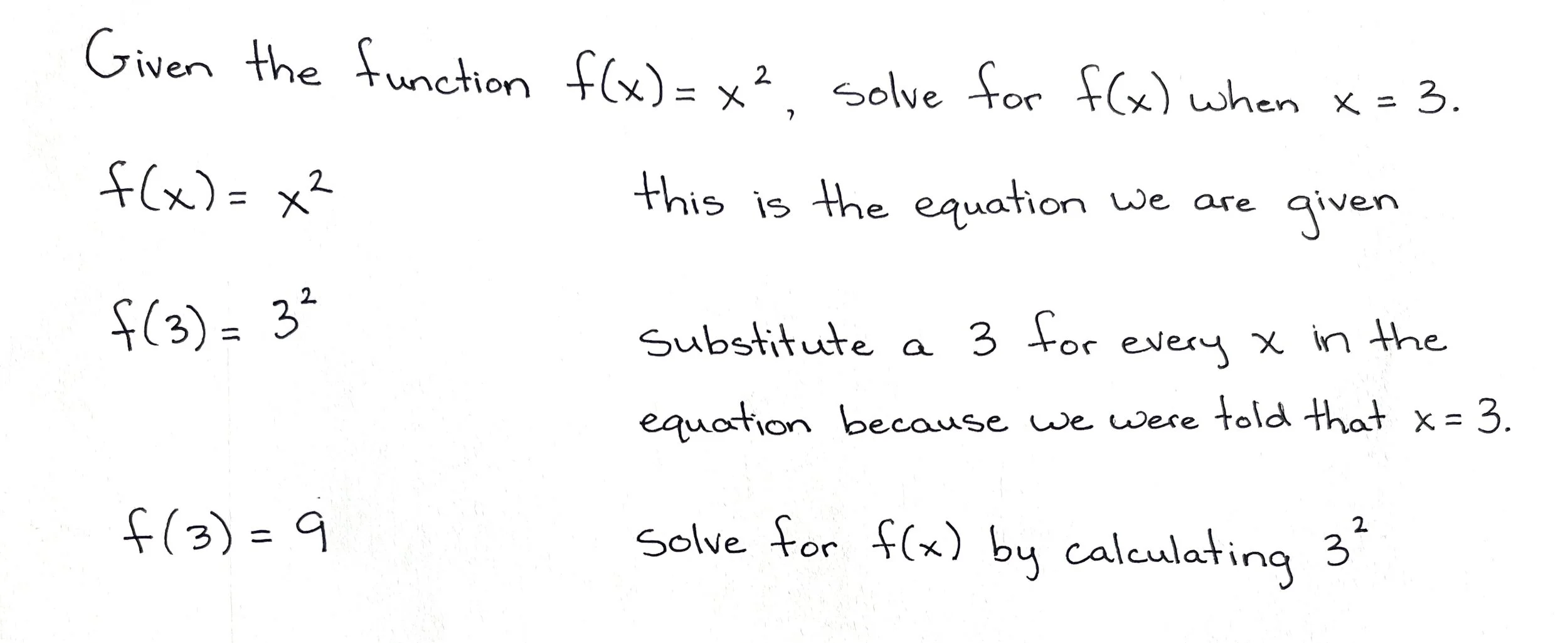 To solve a function for its y value, also written as f(x), input a given number into the function. We do this by replacing all the values of x in the function with the number given to us in the question.